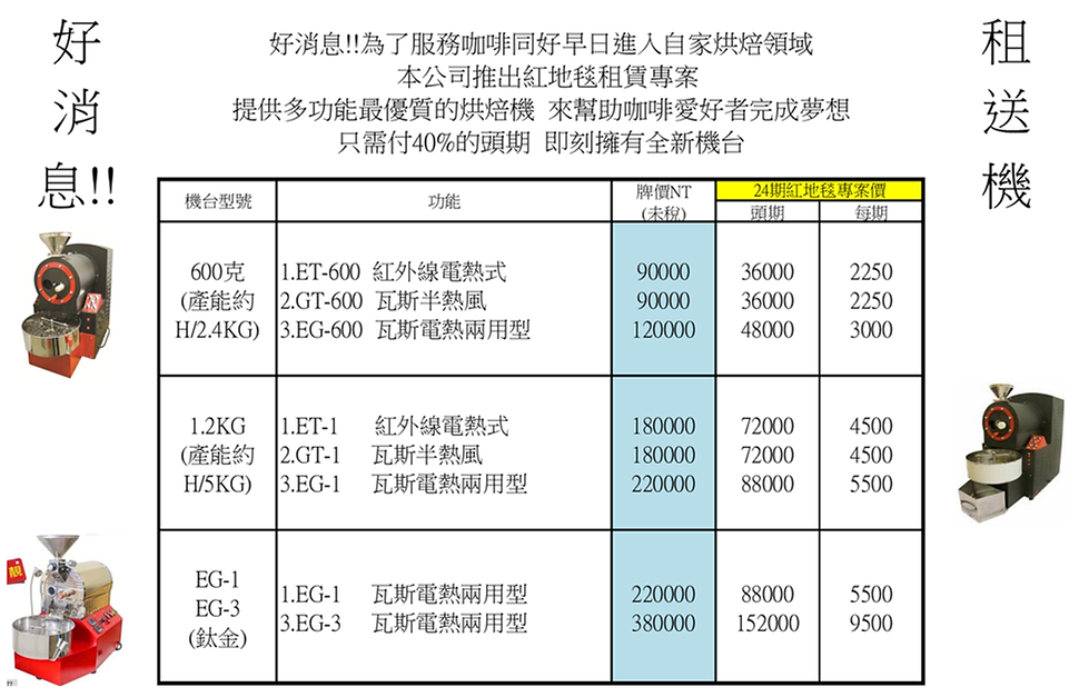 好消息!!為了服務客戶及其他大眾 本公司推出紅地毯租賃專案來幫助想換機台或想投入此領域的朋友們各機型全新機台只需付定價的40%的頭期 即刻擁有全新機台 其餘金額以二年24期分期 (每期需繳交金額請見如下表格) 輕鬆繳費 二年後機台所有人為租方所有